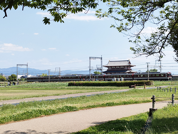 朱雀門の傍を横切る電車。味があるからこのままでもいい気がするけど
