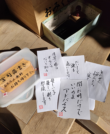 神社の宮司さんが書いた落書き?がタッパーに入っており、持ち帰り自由だったのでいくつか頂戴しました。達筆!