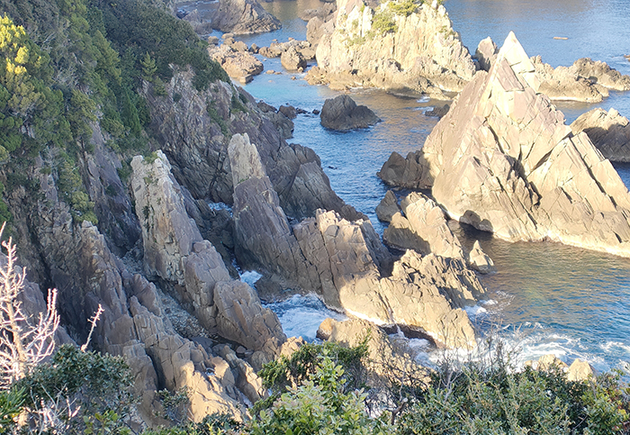 海金剛のこの景観は、マグマからできた岩が太平洋の荒波で削られてできたらしい。