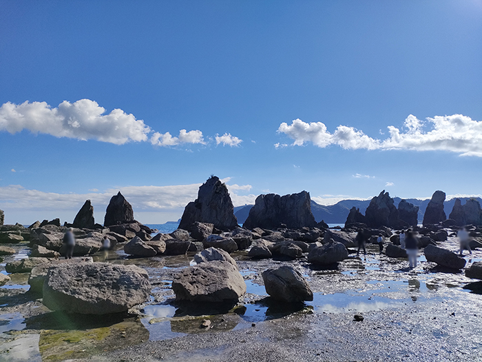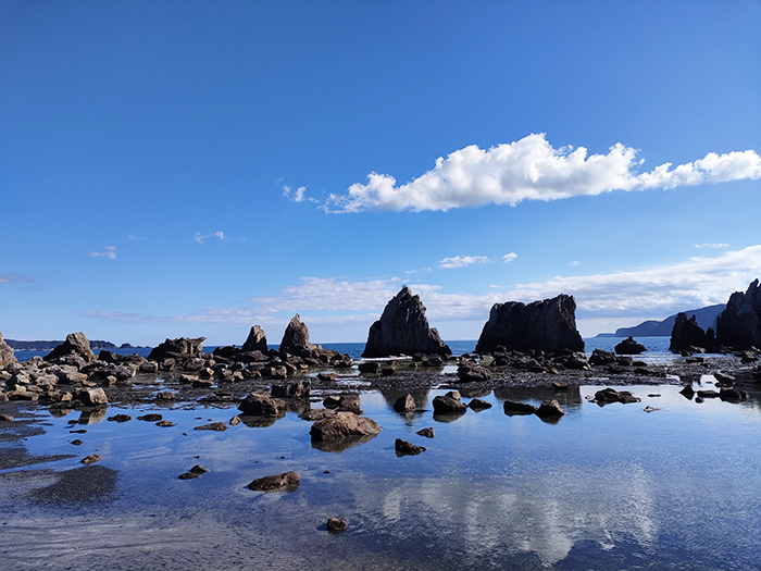 岩がまるで橋脚(橋杭)のように直線状に並んでいる橋杭岩。